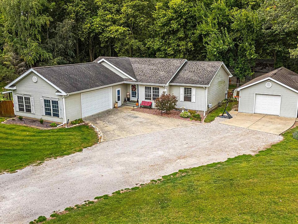 Beautiful 3-bedroom, 2 full bath 2005 constructed vinyl sided ranch style home perched upon a mature .44 acre lot just outside of town within Chester-East Lincoln school district! The interior is sure to please with its gracious open living/dining/kitchen concept boasting great floor space, ample natural light, overhead cathedral ceilings, breakfast bar area, solid surface countertops, central gas log fireplace with adjacent built-ins, adjacent pantry as well as laundry area, and a rear facing exterior access point. Interior also features three nice sized bedrooms as well as two full baths (primary suite features an adjacent private full bath with a double vanity, shower, and whirlpool bathtub). Property also features a sizable 2+ car attached heated garage that is currently used as a game room/den (has two exterior access points, operable sink, and an adjacent mechanical closet), two nice deck areas, an attached covered patio area, large fenced backyard with a storage shed, and a large detached heated garage with both an attached workshop as well as storage area. Edge of town living with natural gas (NO propane). Private well/septic system on premises. So much to offer here both inside as well as outside -- choice home, choice spot!