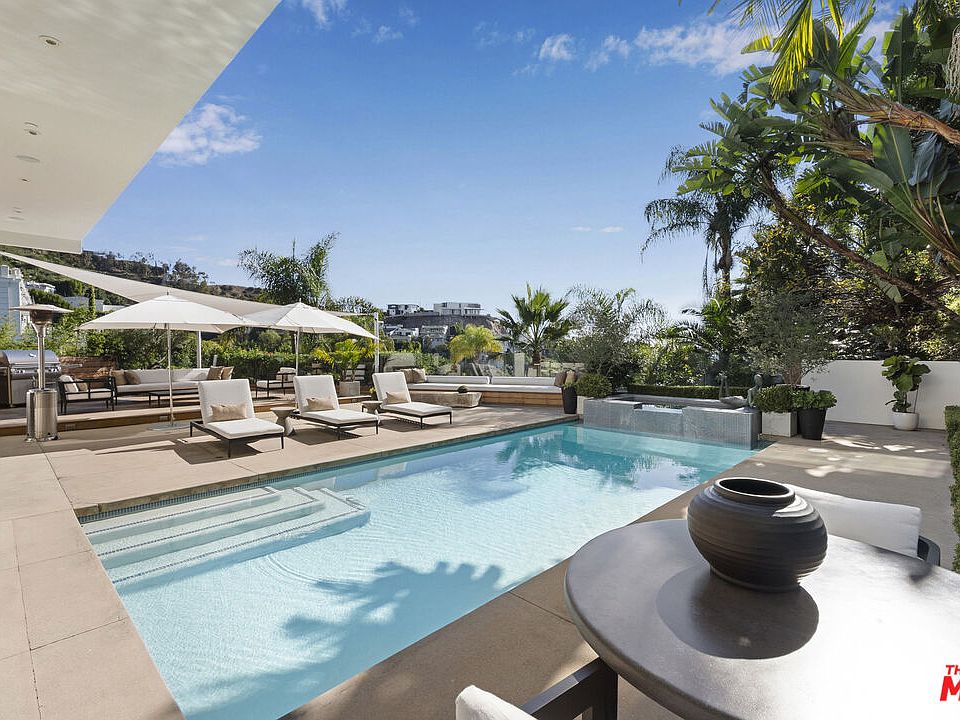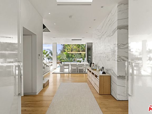 Above Sunset Plaza, this California contemporary welcomes you with a gated approach, a calming water feature, and impressive double doors. Inside, the home opens to dramatic 15-foot ceilings, expansive glass, and sun-filled spaces that open directly to the pool and an expansive outdoor living area, creating a incredible sense of openness. A bright open kitchen, sophisticated wet bar, illuminated Poliform shelving, and a statement marble fireplace anchor the main level, enhancing the home's refined aesthetic and offering an elevated environment for both everyday living and entertaining. The primary suite captures sweeping canyon and city views, providing a serene and private retreat.