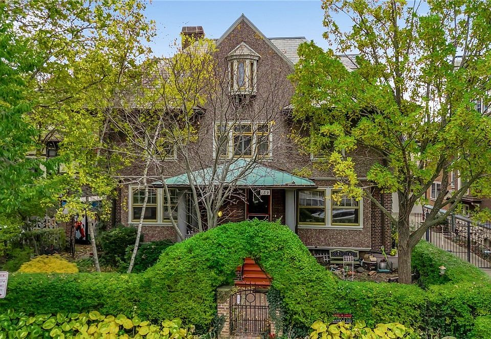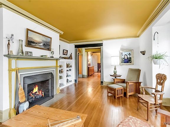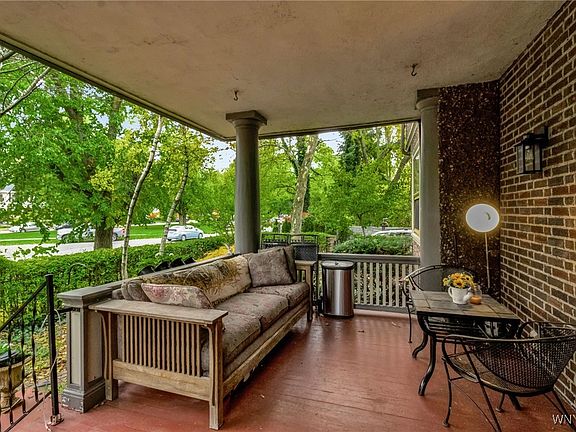 A rare & historical gem c. 1909 boasting original period integrity, detail, and craftsmanship. Commanding brick & stone presence on a picturesque Parkway setting. Cloistered grounds, ornate wrought & artistry fencing, extensive gardens, flowering trees, and pond- an urban slice of serenity. Interior design personally curated by artist and musician Ani DiFranco, who made this her home for 20yrs. Gracious entry foyer captures the warm & welcoming grace throughout, detailed archways w keystone medallions. LR boasts sunlit windows, gas fireplace, bookshelves, French doors to side terrace. DR grand in size, butlers pantry, and fabulous kitchen boasting granite, Viking stove, suite of ss appliances, breakfast rm. Stunning detail on staircases w/ ornate glaze & paint, gorgeous spindles, grand leaded glass window. Custom imported glazed tiles & fixtures in the ‘Ani’ bathroom, sunken tub, walk in shower. Main bath w mosaic tile flooring & proper fixtures. 3 large BRs on 2nd floor, gas FP in front BR, walk-in finished closet & enclosed porch in back BR. Fabulous 3rd floor, excellent space for workshop, studio, office, guests, has finished bath, BR, LR, kitchen, very bright and sunlit. MECH: electric service ‘22, 4-zone boiler ‘15, HWT ‘25. Verdigris roof covering front porch. Slate roof regularly serviced, copper gutters, cement soffits. A unique gem of a home on a secluded sanctuary in the heart of the Elmwood Village. Showings begin Sat 11/15 2 10am