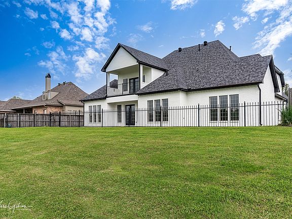 Grand exterior facade with sleek painted brick and black accents. This home was designed for entertaining and features two living rooms. Formal Dining Room. Living Room with beautiful natural light. Family Room features to-the-ceiling fireplace, oversized modern fan as well as built-in cabinetry. Downstairs Powder Room. Chef's Kitchen, featuring stainless steel appliances, custom cabinetry, oversized island with storage and gas cooktop, two sinks and quartz countertops. Breakfast Room flanks the Kitchen. Private Primary suite features a tray ceiling, large walk-in closet that provides an abundance of storage and a luxurious spa-like bathroom complete with a soaking tub, walk-in shower, and dual vanities. Custom mud bench off of the 3-car garage. Spacious utility with decorative tile, sink and storage. Downstairs Guest Suite. 4 generously sized bedrooms (2 down, 2 up). Unbelievable Home Theater with theater recliners, cinema surround sound and wet bar. Water views from almost every room. Two Private Offices with built-ins (One upstairs, One Downstairs). Upstairs game room with mini kitchen and sink. Game Room features French Doors that open to the Balcony.