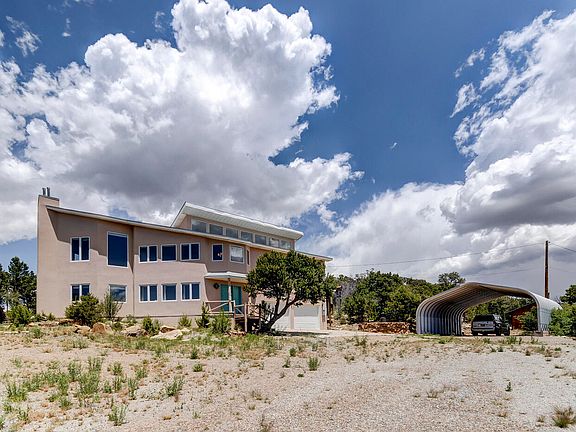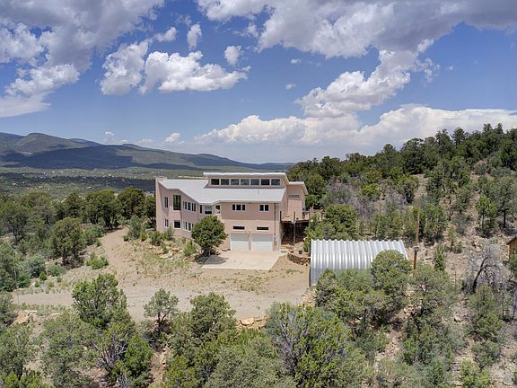 Serenity Awaits! Mountain Top Estate! Beautiful Wooded Property spans 3.8 private acres! Dramatic Views! New Designer Lighting! Upper level features a spacious Living Room flowing into a 32-foot Dining Room! Retreat into your Sunlit Primary Bedroom/Luxurious Bath w Fresh paint! Dual Owner's Suites or In law Suite! This versatile home boasts 3 bedrooms, 3 baths + multiple spaces ideal for office/studio/play room! Enjoy Nature-Trailhead access to 700 acres of Milne Open Space nearby! Oversized 2 car Garage/Covered RV parking!. Don't miss the fun ''he shed'' past RV area! Energy-efficient, passive solar design! Clerestory Windows! Experience Mountain Splendor and Privacy with modern conveniences and endless outdoor activities only 20 min to ABQ!Fenced garden w auto water system!