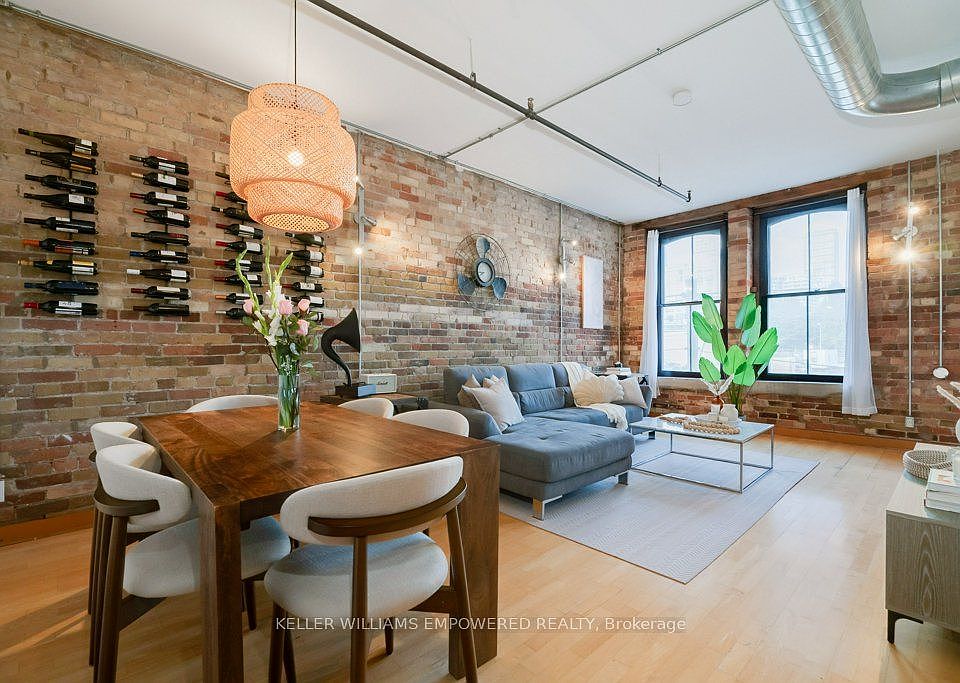Welcome to Suite 5 of the Boiler Factory Lofts, a boutique heritage conversion with only 11 units. This is a rare opportunity to own a piece of history with exceptional value potential, thanks to the upcoming Ontario Line subway and redesigned park across the street. This true hard loft with low monthly fees offers 890-sqft featuring exposed brick & beams, 10-ft ceilings, oversized windows flooded with natural light, and a 30-ft statement chalkboard wall. The fully upgraded kitchen boasts ceiling-high cabinets and features a Viking professional gas range and hood, Blomberg fridge, Grohe semi-professional faucet, and Franke fireclay farmhouse sink. Thoughtful layout includes spacious bedroom that can easily accommodate a king-sized bed, formal dining area, two closets, ensuite storage unit, and laundry closet. Experience total Zen in your own 243-sqft. private rooftop terrace with striking skyline views, a true urban oasis for relaxing or entertaining. Convenient parking on Britain Street with direct rear access to the building. With a walk score of 98, you are steps to St. Lawrence Market, Distillery District, Financial Core, Eaton Centre, multiple parks, and have quick access to the Gardiner and DVP.