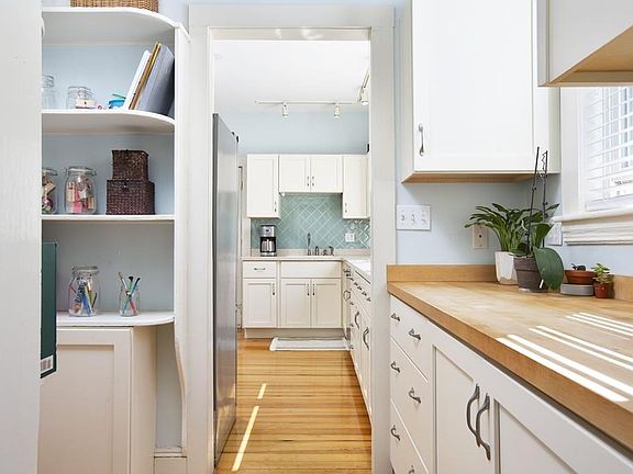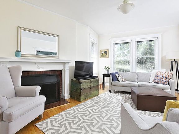 Atop Aspinwall Hill and close to Washington Square, Brookline Village and Runkle School, this stunning condominium is part of a 100% owner occupied three-unit association. It is less than a half of a mile to the C and D lines. With high ceilings and plentiful windows, this sunny condominium feels even larger than its 1,422 square feet. An oversized foyer opens to the living spaces and has a large closet. The spacious living room offers a beautiful fireplace, and opens to the lovely dining room with a coffered ceiling and bay of windows. A great butler's pantry leads to the renovated kitchen with abundant cabinetry and high-end stainless appliances. Off the kitchen is the laundry room with a door to the back deck. There are two bedrooms at the back of the unit and one off the foyer, each a with wonderful closet. The bedroom off the foyer has a door to the front deck. Secondary stairs off the kitchen lead to the basement with private storage as well as the driveway with 1 assigned space