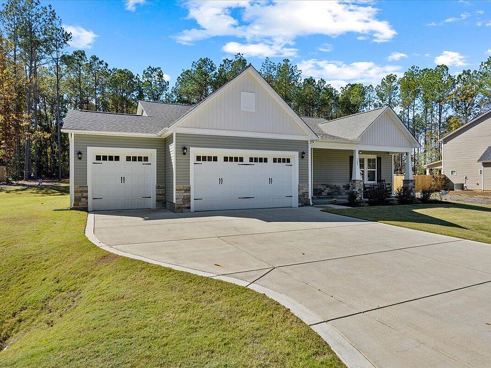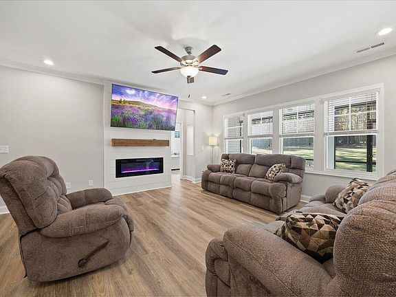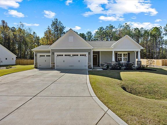 Experience peaceful living with this beautifully maintained 3-bedroom, 2.5-bathroom ranch home on a prime lot in the Pine Tree Knolls subdivision. This better-than-new home is situated on one of only two lots in the subdivision with a wooded view from the front porch and back porch. The property boasts a professionally landscaped and sodded front and back yard, creating a stunning first impression and lots of room to enjoy outdoor living. Step inside to an inviting interior featuring luxury vinyl flooring throughout — no carpet here. With an open floor plan and expansive kitchen layout, the kitchen is equipped with granite countertops, soft-close cabinets, an included refrigerator, and a recently upgraded dishwasher. Relax or entertain guests on the screened back porch that is fitted with custom solar shades, or hang out on the exterior patio which is ideal for summer grilling. The exterior includes rain gutters with added gutter guards for reduced maintenance. The large master bedroom awaits with the other two bedrooms situated in a split floor plan for privacy. Both full bathrooms feature double sink vanities. A three-car garage provides plenty of space for vehicles and storage. This rural retreat offers the tranquility you crave while keeping you within minutes to local shopping, including the new Eastfield Crossing Shopping Center, Carolina Premium Outlets, and all the local shopping favorites that our small bustling town offers! You'll find yourself a 45-minute drive or less to Raleigh, Goldsboro, and Wilson for more shopping and entertainment needs. Schedule your showing today to be a JoCo local!