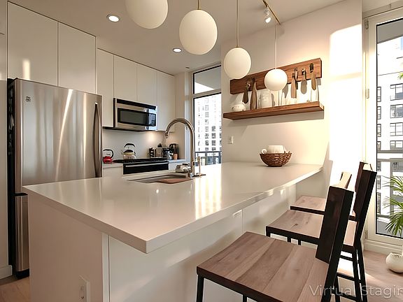 Spectacular Romantic Corner 1 Bed + H.O. / 2 Bath wrapped in Floor-To-Ceiling Stunning Panoramic Views of Brooklyn, New York City Harbor and Verrazano Bridge offering Ample Space to Entertain and WFH, featuring an Open Designer Windowed Kitchen boasting Profile Series Stainless Steel Appliances and beckoning culinary creativity with a generous Caesarstone Island Counter