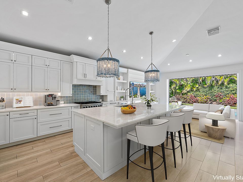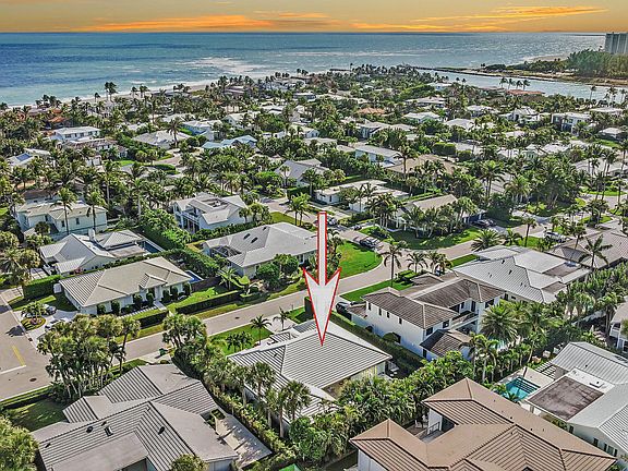 Enjoy your morning coffee and stroll to the beach. This elegant 3-bedroom, 3.5-bath home in the exclusive Jupiter Inlet Colony captures the essence of refined coastal living, where timeless design meets modern comfort.Soaring cathedral ceilings draw in abundant natural light, lending the open interiors an airy, inviting atmosphere. Stackable sliders open completely to the covered patio and heated pool, blending indoor and outdoor spaces for the ultimate coastal lifestyle -- perfect for entertaining or relaxing in privacy. The chef-inspired kitchen is a true centerpiece, featuring a lighted marble island, custom cabinetry, premium gas appliances, and designer finishes that combine function with beauty. Every detail throughout the home has been thoughtfully curated from the bespoke built-ins and wallpaper accents to elegant lighting and window treatments.