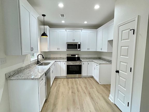 Separate walk in showerTrue mudroom with lockersSoaker tubVinyl wood plank flooringStainless appliancesLarge utility roomGranite countertops