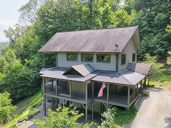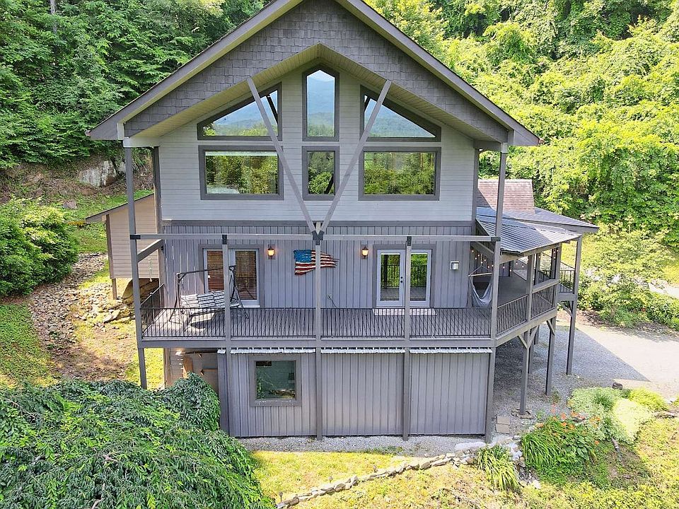 Privacy, Views, Trees, Greenery, Wildlife, Natural Stone abound from this cabin nestled in the woods of Trillium Heights. The property offers end of the road privacy, lower level 2-car garage with workshop space, tons of natural landscaping, shed and firepit as well as an expansive covered deck. The cabin features master on the main with spacious bath, 2 walk-in closets as well as laundry on the main. The open concept kitchen and living area are complete with granite countertops, solid wood cabinets, large center island, storage, pantry, bath, stacked stone gas fireplace, hardwood floors and tons of natural light. The upstairs has a loft space and 2 bedrooms with adjoining bath. This is a very spacious cabin conveniently located between Hayesville and Murphy just up the road from Brasstown. Come enjoy the mountains, views as well as the community river access area that includes a pavilion; great for entertaining. Property offered with furnishings.