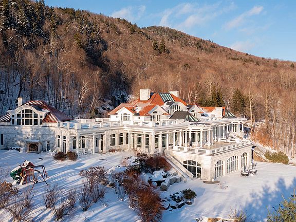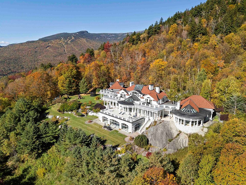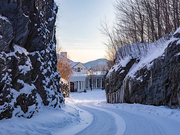 A design and materials masterpiece, Above the Clouds is one of the most spectacular estates in Vermont. Embedded into rock outcroppings on 15 pristine acres, the setting and views are simply breathtaking. Vermont Danby marble was brilliantly selected as the primary exterior material, and numerous local hardwoods, Italian marble, and sandstone are featured throughout the interior. A spectacular array of floor-to-ceiling windows brings the outside in, creating a beautiful, light-filled home with expansive views from every room. Crafted for grand entertaining, upon entry, a dramatic foyer leads to the dining and great room, which immediately directs your attention to a spectacular veranda and panorama to the mountains and valley below. The primary suite, a private oasis, includes a sunken seating area and splendid bath. Two spacious guest suites grace the upper level with individual terraces, fireplaces, and spa-like baths. A third, private suite, will comfortably host longer-term guests or serve as staff quarters. The lower level is an exquisite recreation venue. A full cocktail bar can host your guests before adjourning to either the 18-seat home theater or game room with marble fireplace; all overlook an opulent, indoor pool and spa. Outdoors is a perfect landscape with stone terraces providing unlimited vantage points and stunning views. Even the drive, forged in stone, provides a spellbinding entry to the property, evoking total privacy, revealing this grand estate.