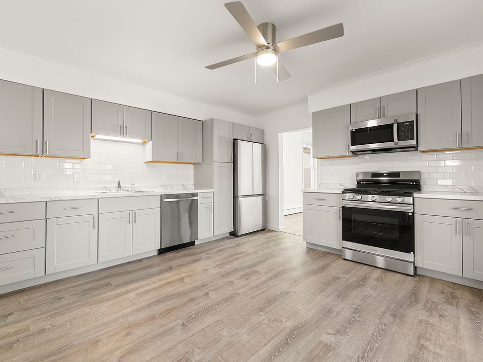This freshly renovated 3 bedroom, 1 bath apartment features spacious bedrooms, a modern spacious kitchen with dishwasher, refrigerator and lots of counter space with enclave for a table. Spacious living room perfect for entertaining. Unit features washer and dryer hookups. Landlord pays water, tenant responsible for electric and gas. Prime location for commuting. Close to highways and bus lines. Move in ready and waiting for you schedule a showing today!