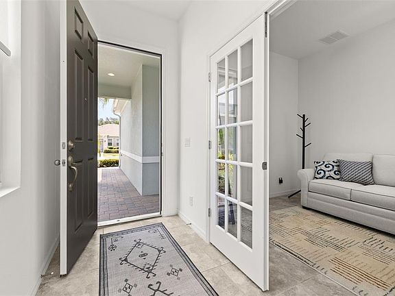 Imagine waking up each morning to breathtaking views of the 16th hole of Mystic Dunes Golf & Country Club, right in your backyard! This stunning 2 bedroom, 2 bathroom villa with a versatile den that could easily serve as a third bedroom invites you to experience the best of maintenance free living in the highly sought-after 55+ gated community of Four Seasons at Orlando. Perfectly located just minutes from Celebration and the magic of Walt Disney World, this home blends luxury, comfort, and an unbeatable lifestyle. Step inside to discover an inviting open concept design featuring ceramic tile throughout and a gourmet kitchen that serves as the heart of the home, complete with granite countertops, soft-close white cabinetry crowned with molding, a natural gas cooktop, built-in wall oven and microwave, spacious pantry, and an oversized island breakfast bar that seamlessly flows into the great room which is ideal for entertaining and everyday living. The great room and bedrooms feature custom window coverings, while motorized custom shades over the sliders add a touch of elegance and privacy. Retreat to the spacious primary suite with dual vanities, ample storage, an oversized walk-in shower with designer tile, a separate water closet, linen closet, and a generous walk-in closet. Additional highlights include rain gutters, a brick-paved driveway and walkway leading to the front door, a two car garage, laundry room with washer, dryer, and utility sink, French doors opening to the den/flex room, and a private paved patio is perfect for morning coffee or evening sunsets. Four Seasons at Orlando features a 14,000 sq. ft. clubhouse with a state-of-the-art fitness center, resort-style heated pools, jetted spa, tennis, pickleball, bocce ball, a full-time activities director, on-site dining, and more! Embrace the lifestyle you deserve in this exceptional villa!