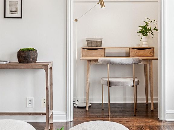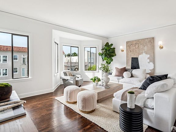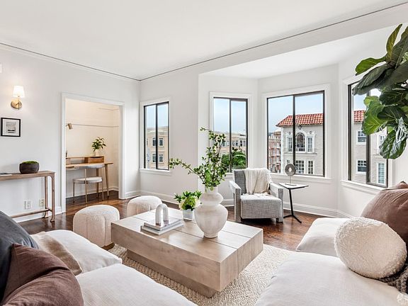 This light and bright one-bedroom flat is perched above quiet Jefferson Street in the center of San Francisco's Marina District. The sunny living room is the heart of this unit, with views stretching from the Marin hills, to the sailboats in the Bay and the rooftop of the Palace of Fine Arts. Beyond the living area, the superb layout of this top-floor unit also includes a separate kitchen and dining area, an office nook, and a large primary bedroom with an ensuite, remodeled bath. Situated just one block from the Bay, the Marina Green, and the St. Francis Yacht Club, the rich amenities of Chestnut Street are also just minutes away.