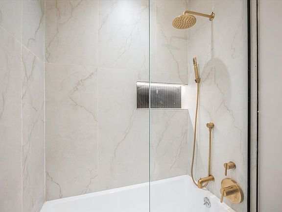 Oversized floor-to-ceiling windowsContemporary bathroomGenerous natural lightIn-unit washer and dryerCozy light-filled living spaceOpen-concept layoutStainless steel appliances