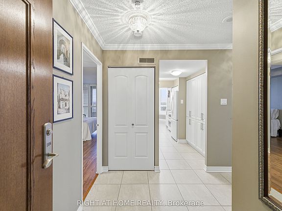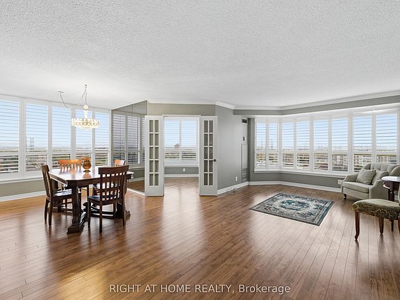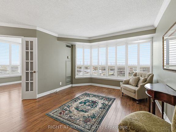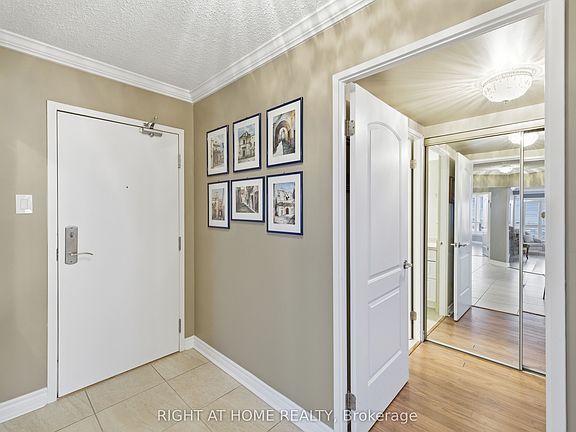 Step into the sought-after Cartier Model, an immaculate corner residence in Tridel's Discovery Place, showcasing nearly 1,500 sq. ft. of bright and well-designed living space. Sunlight pours in through the southeast-facing windows, highlighting the airy layout and offering seamless access to a private balcony-perfect for morning coffee or relaxing evenings. The suite features a spacious formal dining area within the living room, beautifully enhanced by crown moulding throughout, adding an elegant, refined touch to the main living space. The modern kitchen is ideal for everyday living, featuring an eat-in area and generous cabinetry for effortless organization. The entire suite is enhanced by California shutters, lending a bright, clean, uniform, and welcoming look. Both bathrooms are impressively sized and styled with contemporary finishes. For added convenience, the home includes oversized in-suite storage, an additional locker, and underground parking.Residents benefit from the exceptional lifestyle offered by this secure, resort-inspired community, complete with indoor and outdoor pools, hot tub, fully equipped fitness centre, tennis and squash courts, party rooms, guest suites, 24-hour security, and plenty of visitor parking. With all utilities included in the maintenance fees-water, heat, hydro, cable TV, and high-speed internet-daily living is simple and stress-free.Situated steps from Pickering Town Centre, the library, civic centre, parks, recreation facilities, and the GO Station, and minutes from Highway 401, this suite delivers the perfect blend of location, comfort, and convenience.