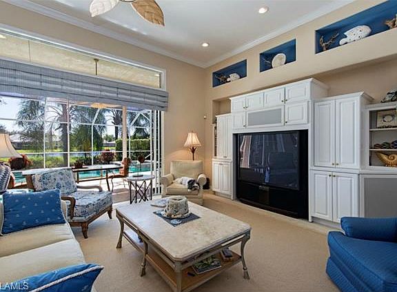 H.8660 - Stunning views from lake to golf course from pool & spa. Well-situated on the Stonebridge Country Club (private golf membership included), this one-story, Ralph Lauren decor home is offered turnkey, complete with 7 televisions including a 60" model in the LR. 4913 T. sq ft. This desirable 3+1 bedrm property features LR, DR, gourmet cook's kitchen, family room, office, wifi 3 baths, a 3-car garage and electric heated pool with poolside dining area. Nutone central vac. Electric Hurricane shutters and white Plantation shutters thru'out. Stonebridge amenities include a newly-renovated clubhouse for casual and fine dining, Har-Tru tennis courts, a complete fitness center & an 18-hole championship golf course redesigned in 2010 (all included in HOA). Stonebridge in Naples, all of above and just 3 miles to the gulf & beach!