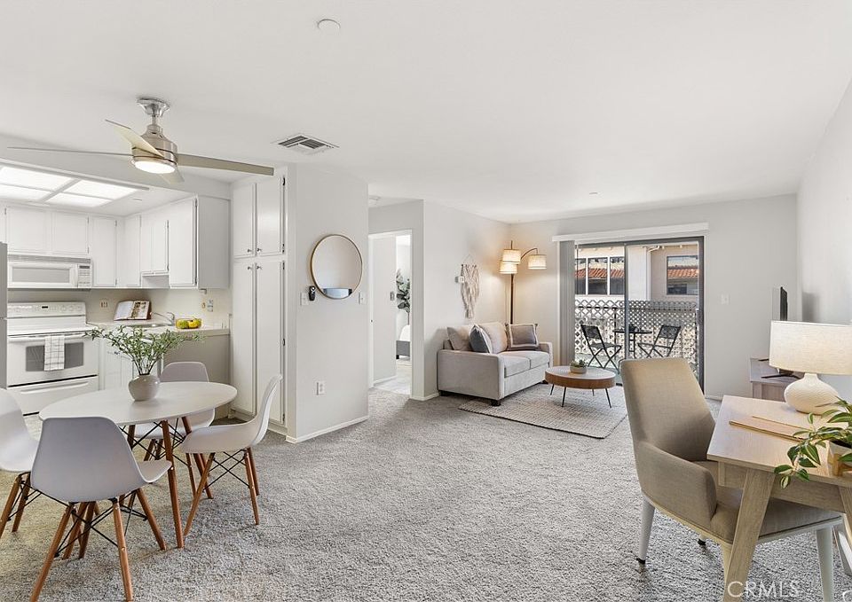 Gorgeous condoSpacious private balconyLight and bright kitchenGorgeous paintWhite cabinetryOpen floorpanDining area