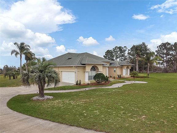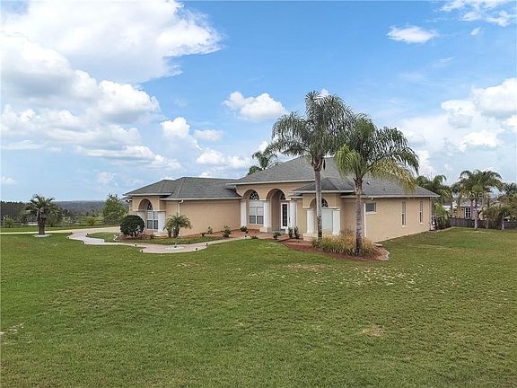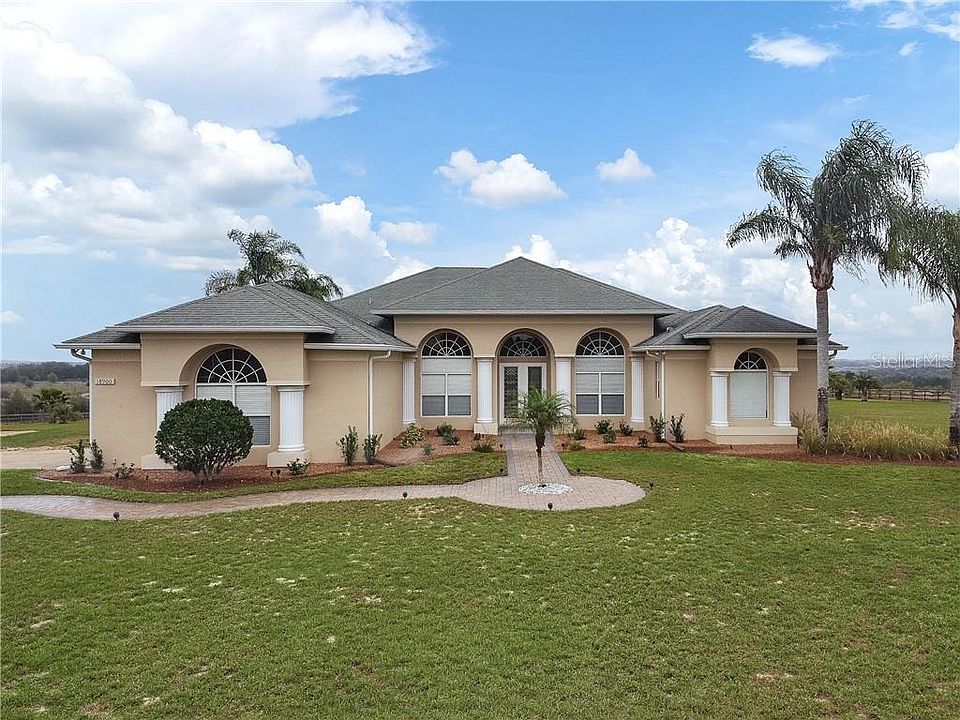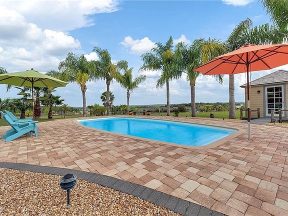 Enjoy every moment residing on five acres of one of the most tranquil settings here in Groveland FL. With panoramic East views of the rolling hills, nature and farmland expect incredible sunrises and peace. Clay roads make up the main entry and exit roadways followed by the homes private electronic gated entry. The homes open layout offers a formal dining and formal living room with triple sliders that allow access to the back patio. Span over to the right where the fourth bedroom is located complete with a closet, a separate pool bath, and a master suite with an additional sitting area. The expansive master bath offers dual sinks, linen closet, garden tub, separate shower, and private water closet. Opposite the master is the second and third bedrooms split with a full bath. The kitchen and living area combo offer plentiful cabinet space, newer stainless steel appliances, closet pantry, breakfast bar, and separate eat-in dining area. Additional windows were installed to provide an added abundance of natural light and tropic views of the backyard setting. With its Key West vacation feel, escape into its surroundings with a Tiki Bar, Palm trees, pool fountains and plentiful decking. A workshop that measures 30 x 50 is located towards the back of the property. If space is needed to store additional vehicles, for use as a shop, or crave a hobby space this is it! This property is move-in condition and has been meticulously maintained. Must see to appreciate all it has to offer!
