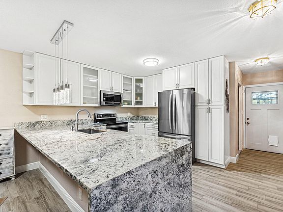 Set in Town Villas, a quiet 55+ community, this 2 bedroom, 2 bathroom villa is fully turn key and ready for a fast move. Ceramic wood-look tile floors run through the home, and the kitchen stands out with solid wood cabinets, quartz counters with a waterfall edge, a farm sink, and beautiful pendants. Both bathrooms are updated with clean finishes. The primary suite has a wide walk-in closet and generous space for a sitting area. You have a full washer and dryer, a long one-car garage, and four guest spots right out front. The back yard has open green space and room to add a screened patio if you want more outdoor living. Move in now and start the new year in comfort. Homes this ready tend to move fast. Let this be your next home.