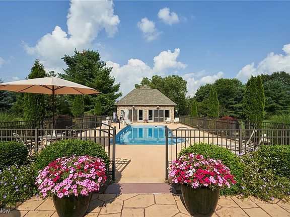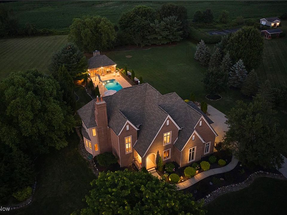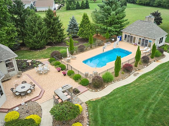 This stately home offers a rare opportunity to enjoy a life of comfort, privacy & connection to the outdoors. Set on approximately 2 private acres in Highland Local Schools on a cul-de-sac street in Wolf Creek Estates.The standout backyard, designed for both relaxation & entertainment, features an in-ground heated pool, 432-sq-ft pool house w/ A/C & heat, 2-level stamped concrete patios w/ built-in grill & bar seating, firepit table & a scenic backdrop of open land with no rear neighbors. Inside, over 3,874 living sq ft blends timeless architecture w/ flexible living. A 2-story foyer opens to elegant spaces w/ hardwood flooring, crown molding & wainscoting. A formal dining room features a double-sided fireplace, shared with a family room, and flows into a light-filled living room w/ a 2nd fireplace, wet bar & wall of windows overlooking the backyard. A 1st-floor office is rich w/ built-ins & detailed trim. An eat-in kitchen is warm and functional, w/ granite countertops, stainless steel appliances, center island & a bright dining area w/ built-in breakfast bar surrounded by windows. A 1st-floor laundry room adds convenience. The owner’s suite includes a tray ceiling, 4th fireplace, dual walk-in closets, and spa-like en-suite bath w/ tiled walk-in shower, jetted tub & double vanity. Two additional bedrooms share a Jack-and-Jill bath w/ separate vanity areas. The 4th bedroom guest suite features its own full bath & generous closet space. The pool house extends the home’s comfort & charm w/ a vaulted beamed ceiling, wood-burning fireplace, half bath & built-in drink cooler, perfect for year-round entertaining. Additional features include a BRAND NEW ROOF, rough-in plumbing for a full bath in the basement, attached 3-car garage & a rear outbuilding w/ overhead door. Nestled in a quiet neighborhood surrounded by nature & wildlife, Wolf Creek Estates also offers a community green space across the street w/ pond access for fishing and recreation.