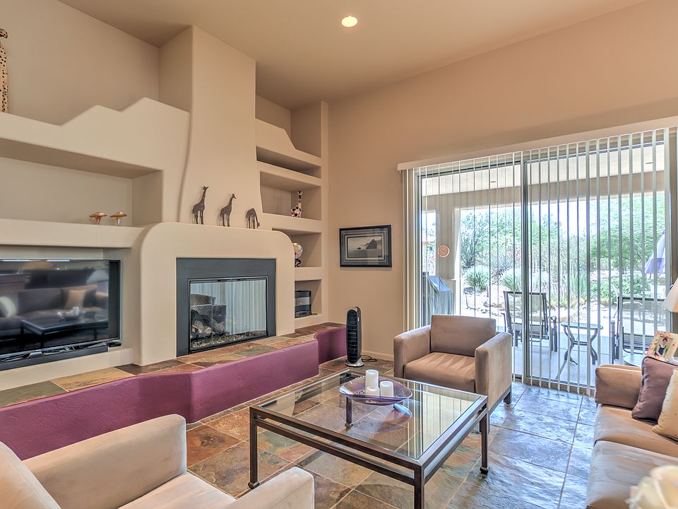 Lovely single-owner townhome in Tonto Verde, a premier 55+community bordering a natural mountain preserve. This home has a highly desirable great room floorplan, with soaring ceilings, a stately gas fireplace and slate flooring. Offering 2 bedrooms, plus an office with custom built-in cabinetry. lots of storage space, 2 full bathrooms and a powder room. The master suite is open and inviting with neutral carpet, direct entry to the extended patio, a large walk-in closet, and lots of light. The guest wing is in its own wing & includes a large walk-in closet and bathroom. Well-maintained, the A/C is less than 5 yrs old, and the roof routinely sealed. Enjoy beautiful Arizona days on the large patio or take the golfcart over the active Tonto Verde clubhouse nearby. Read on, click MORE