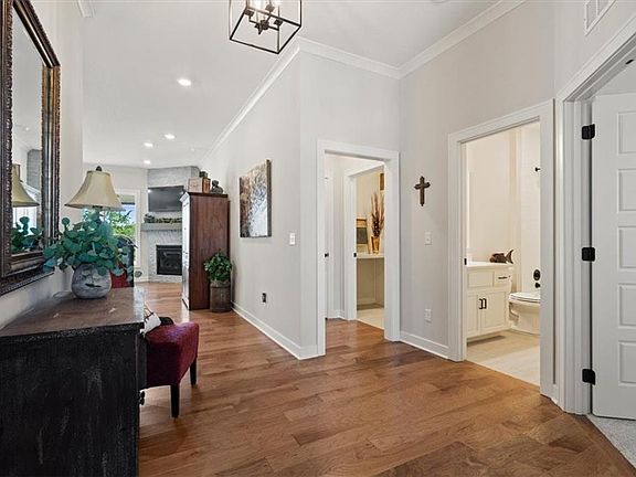 Walk through the front door and you’re greeted by sunshine and space. The great room takes center stage with its stacked stone fireplace and wall of windows that put the tree line on full display.