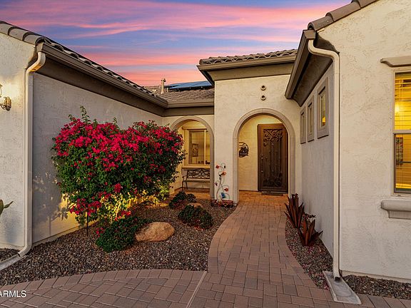 Stunning Endeavor model on the 6th hole of Sun City Festival's Mountain course. This east-facing backyard captures both golf and mountain views and includes a putting green, water feature and BBQ area. Enjoy the views and the vibrant Sun City Festival 55+ lifestyle! This 2-bed, 2.5-bath, plus den floorplan includes a 32-panel owned solar system. The home is filled with numerous upgrades and special features. The kitchen includes staggered coconut-colored cabinetry with under cabinet lighting, full overlay doors, soft-close drawers with roll-out trays, granite countertops, SS KitchenAid appliances with gas cooktop, tile backsplash and dual basin Blanco sink with reverse osmosis. An elegant wet bar with cabinets, counter seating and wine fridge adds to the home's entertainment value With wood-look tile flooring throughout the home, you'll also enjoy an extension at the back of the home, AV Built-In, den with French Doors, surround sound system, can lighting, custom fans and pendant lighting and pre-wired security system. The owner's suite is spacious and includes a soaking tub and separate frameless glass tiled shower and dual vanities with granite counters. The guest bedroom features a separate bath with shower. The laundry includes the washer & dryer and overhead cabinets. There's also a soft water system and golf cart garage.