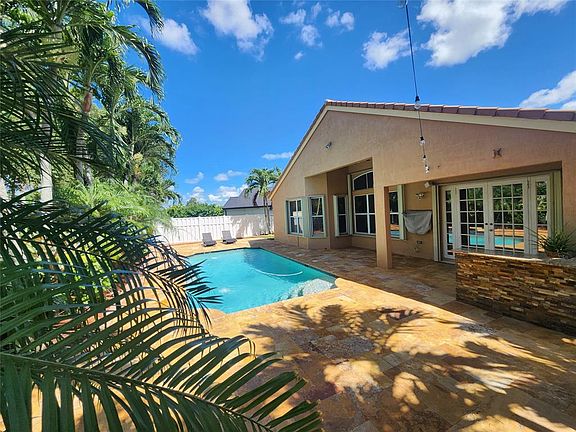 This beautifully updated home in Sunset Lakes boasts four bedrooms and three full bathrooms, featuring new premium laminate flooring in the bedrooms and stylish tile throughout the rest of the space. The expansive kitchen is equipped with brand new appliances and a generous center island, while a separate laundry room includes a new washer and dryer. The interior has been freshly painted, and the windows are adorned with plantation shutters, contributing to the home's bright and airy atmosphere. The outdoor pool area is enhanced by a travertine deck, complete with an elegant built-in barbecue and a covered space for relaxation and entertainment. Residents of Sunset Lakes enjoy access to a fantastic clubhouse and various amenities, all conveniently located within walking distance.