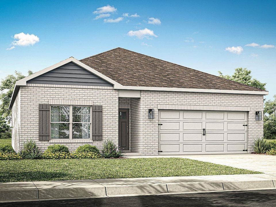 Full Brick Home! The Aldridge plan is 3-bed, 2-bath single-story home with over 1,200 sq ft and a 2-car garage. The primary suite features a walk-in shower, double vanity, and large closet. The kitchen includes granite or quartz countertops, stainless appliances, a pantry, and breakfast bar, opening to the living and dining area with porch access. The Aldridge includes a Home is Connected smart home technology package - making us America's Smart Home. Photos are for representational purposes.