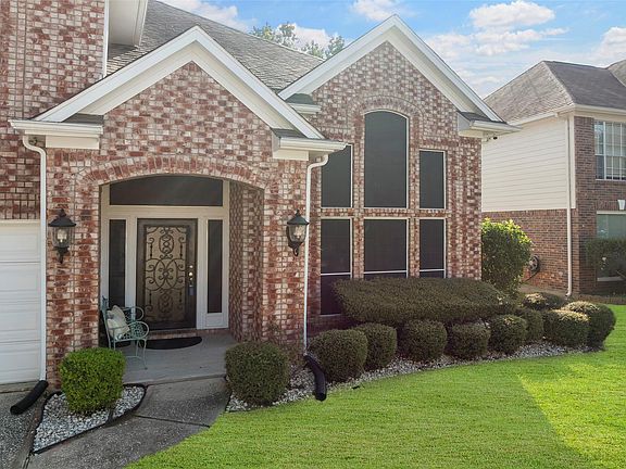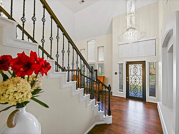 Step into sophistication at this fully updated 3-bedroom, 2.5-bath home in desirable Atascocita Timbers. The home makes an immediate impression with a dramatic two-story entry, soaring ceilings, and a stunning crystal chandelier, complemented by rich wood-look flooring throughout the main level. The heart of the home is the gourmet kitchen, featuring sleek white cabinetry, quartz countertops, and stainless steel appliances. Architectural details like the custom wrought iron staircase and arched windows enhance the elegance and brightness of the living spaces.