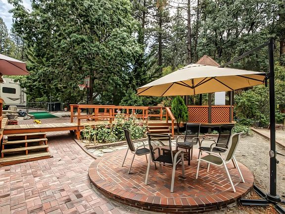 Beautiful home in one of the most desired neighborhoods of Wrightwood. This home sits on a large, corner lot with TWO driveways. This property has amazing landscaping with a water fountain, stone table & benches, and a gazebo that has a wood deck and DRAWBRIDGE. There is also a firewood storage shelter, fruit tree orchard, and fenced backyard. Inside you will find a charming family room with a wood burning stove and built in bar. There is also a fireplace in the living room. Don't miss the several nooks and crannies to create adorable and unique spaces. Storage is not a problem in this house with four large storage nooks! The master bedroom has a patio and there is also an indoor laundry/mudroom! The natural wood craftsmanship throughout makes the home feel warm and welcoming. There is also a 50 year roof, septic tank aeration system, and a water softener...making maintenance worry and hassle free. With just a short drive to Mountain High you can enjoy snowboarding and skiing in the winter, or you are close to the Wrightwood Country Club to enjoy the lake in the summer.