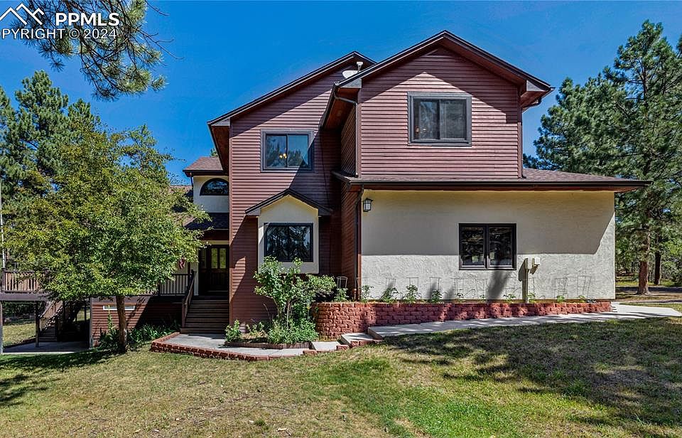 Nestled in the picturesque community of Perry Park in Larkspur, this stunning two-story home offers an enchanting blend of elegance and comfort. With over 3,800 square feet of living space, this residence is designed to cater to your every need. As you approach the property, the wrap-around decks catch your eye, providing a perfect spot for morning coffee or evening relaxation. A sunken area includes a brand new hot tub, making it an ideal retreat for unwinding under the Colorado stars. Step inside to find the heart of the home—a spacious kitchen that will inspire your culinary creativity. Gleaming wood floors stretch throughout the main level, leading to a kitchen adorned with granite countertops and an island featuring a cooktop. A French door pantry adds both charm and functionality. The main level also boasts formal living and dining rooms, perfect for entertaining guests while the vaulted ceilings and large sunny windows bathe the space in natural light. There is a main level office/5th bed, complete with built-in shelving/cabinets. Stylish archways add a touch of architectural flair. Ascend to the upper level, where you'll find the serene primary bedroom. Double doors open to this tranquil retreat, featuring vaulted ceilings and private ensuite. Indulge in the luxury of a soaking tub, a walk-in shower, and a granite double vanity. Three additional bedrooms on this level provide ample space, with one featuring built-in cabinets and shelving. Each bathroom in the home is thoughtfully designed with tile floors, combining style and practicality. Ceiling fans in every bedroom and new (2021) Anderson windows and doors ensure comfort year-round. Off the unfinished basement is a covered rear patio and tool shed that offers convenient storage, while the expansive lot provides a perfect balance of grassy areas and serene wooded sections, offering privacy and a connection to nature. This Perry Park gem invites you to experience a lifestyle of elegance and tranquility.