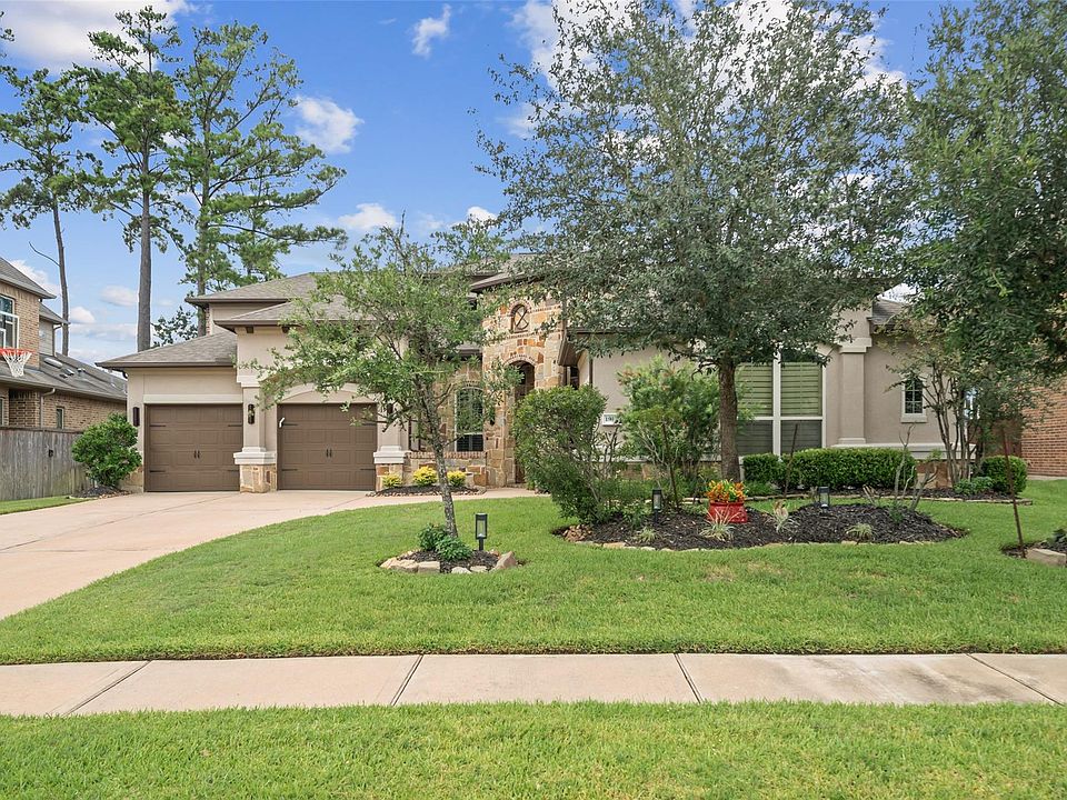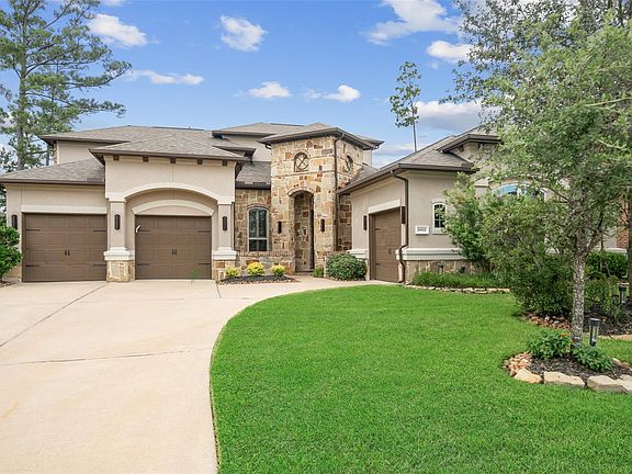 Luxury living in one of the most sought after gated communities of Tomball. Mediterranean style stone/stucco 1.5 story with an array of custom features, Cantera door, walls of windows, architectural flare, high end elegant lighting, custom mill work, hardwood flooring, criss cross ceiling beams, designer window treatments, gourmet style kitchen, granite countertops, abundance of cabinet space, tumbled marble backsplash, entertainment style counter height island, Thor gas cooking, SS appliances, double oven, wine room/bar w/wrought iron enclosure, large primary suite wi/coffered ceiling & separate sitting area. Elegant primary bath w/corner soaking tub & enormous seated/dual head shower, three oversized bedrooms and two full guest baths down. Upstairs boast a game room, full bath w/walk in shower and a media room that can flex for 5th bedroom/upstairs suite. Huge covered back patio, no back neighbors (backs to reserve w/trails), wrought iron fence. incredible storage and so much more!