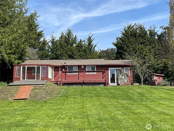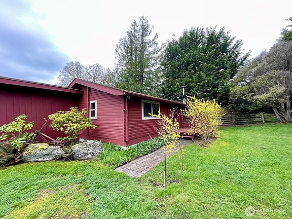Affordable mini farm on San Juan Island! Bathed in sun, this single level Panabode home has one bedroom, office/den, full bathroom. Hardwood flooring in part of house, new laminate flooring in kitchen, heat pump plus wood stove. Ready for your personal touches! South facing, sunroom for plants and large sunny deck with outdoor stone chimney offers many possibilities! Majestic Oak tree graces the property. Large detached 800 sf+ Texmo shop has tons of space for cars and projects. Raised garden beds ready to plant, root cellar, perennial landscaping, and fruit trees. No HOA. Bring your chickens and come enjoy this quintessential Island oasis!