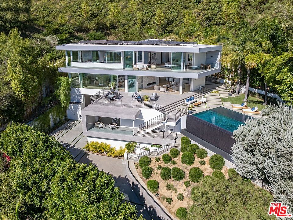 Perched at the top of Rising Glen, tucked away behind a private gate, sits this reimagined architectural estate. Spanning approximately 9,400 square feet, the 6-bedroom, 9-bathroom home blurs the line between indoor and outdoor living. Designed for entertaining on every scale, it features floor-to-ceiling glass walls that frame sweeping views from downtown to the ocean, filling each space with natural light. The open layout flows effortlessly to expansive terraces, outdoor dining areas, fireplaces, and an infinity-edge pool - creating a striking backdrop for gatherings. No detail has been overlooked - from the Poliform kitchen with Miele appliances to the elevator, gym, private theater, and temperature-controlled wine area. Every finish reflects thoughtful design, beautiful craftsmanship, and top-of-the-line construction throughout. With a 3-car garage, generous motor court parking, and total privacy just minutes from the heart of the city, this is a true modern sanctuary in the hills.