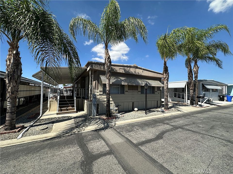 This Manufactured Home is a Large Two Bedroom and Two Bath Home Ready for Move-in ! Large Master Bedroom and Bathroom with Ample Sized 2nd Bedroom. Large Covered Patio off of the Front Door Entrance and Dining Room Sliding Door ! Spacious Floor plan offers a Formal Dining Room and Wet Bar. Also includes a Generous 2-Vehicle Tandem Covered Parking with a Large Storage Shed !