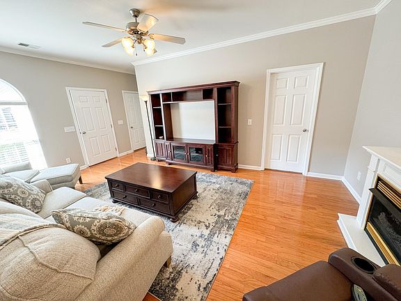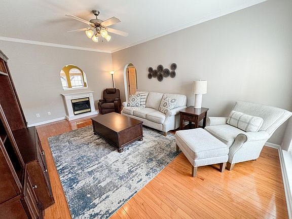 - Spacious interior with hardwood floors, carpet (bedroooms), and a gas fireplace in the living room