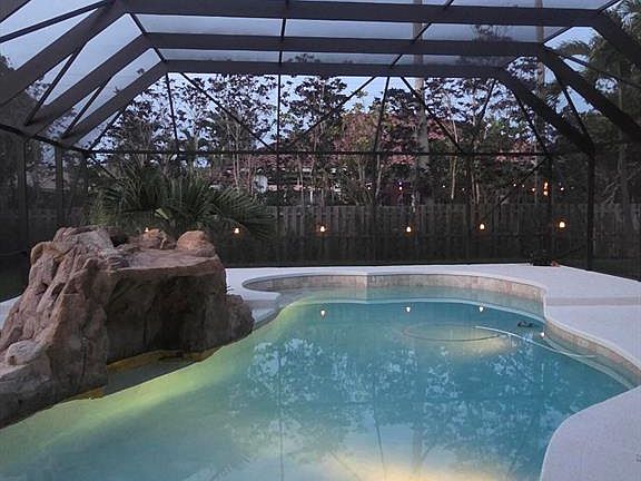 Beautiful, private waterfall grotto pool home is ready to be your oasis. With 4 BR's, 3 BA's, 3 car garage, LR, DR, FR and an office. Large fenced in yard lined with Podocarpus hedge for total privacy and a mature avocado tree, this home checks all the boxes. Solidly built with foam filled CBS construction with double pane hurricane windows, it features 9 ft ceilings in the BR's/BA's, 12 ft ceiling in main rooms and 14 ft ceiling in the entry making all the rooms feel huge. The oversized saltwater pool features a sun shelf, waterfall grotto with seating, and new heat pump. Freshly painted and upgrades galore. Situated on a quiet cul-de-sac street with no power poles or high voltage lines, just 3 miles from I-95. In Martin County with a Jupiter address, the neighborhood offers tennis and pickleball courts. NEW metal roof 5/2025. Room for up to a 18' hull boat or 6' trailer (not including the hitch frame) can be parked on side of house, so long as not visible from the street. This home is fully furnished (like VRBO including linens, dishes, cookware). MBR has King, BR 3 has 2 Twins, BR 4 has Queen. BR 2 have Full and Twin (can be bunks).