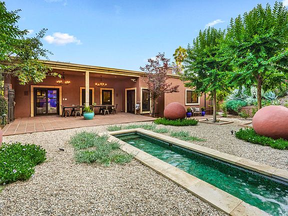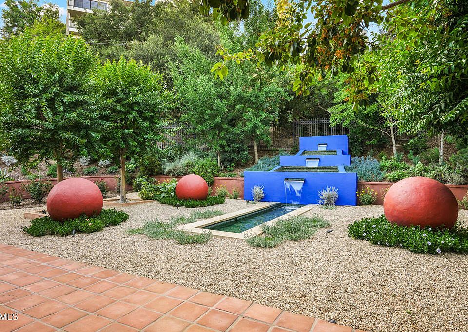 With its stunning architecture, coveted address in Upper Linda Vista, and beautifully-designed outdoor spaces, 1897 Braemar Rd is a secluded Pasadena treasure for those with discerning taste. Designed by esteemed Bel-Air architect Aleck Dugally, whose clients included Sylvester Stallone, Denzel Washington, and Sumner Redstone, this Contemporary Tuscan Villa stands apart with inspired details and a deeply peaceful setting. A grand foyer with a soaring ceiling offers an exquisite welcome. Sunlight pours in from the massive skylight overhead, illuminating the sumptuous travertine floors and offering a prelude to the elegance that awaits within. You'll instantly appreciate how Dugally's semi-open concept layout strikes the perfect balance between spaciousness and separation. The foyer adjoins both the dining room on the right and the sunken living room, which rests straight ahead. The latter offers the perfect setting for an intimate concerto or book reading. A chef-worthy kitchen features a cork floor, top-tier German appliances, and gorgeous wood cabinets. Wrapped in windows and boasting a radiant skylight, this dream kitchen overlooks the breakfast area-your sunlit spot for mindful mornings. Casual relaxation is always on offer in the inviting family room, which includes a large fireplace that creates the perfect ambiance during the winter months. Two bedrooms share a dual-vanity hallway bathroom, while the expansive primary suite is privately tucked on its own wing. This serene retreat is complete with a luxurious spa bath, walk-in closet, and French doors opening to the patio. Step out to your secluded outdoor haven shaded by a Walpole pergola and offering stunning views of the lush greenery in the canyon below. As beautiful as the home's interiors are, its outdoor spaces are equally impressive with expansive patios and decks wrapping all around. The main backyard space showcases modern art in a gorgeous natural setting, with striking abstract sculptures and a statement water feature set amidst lush plantlife. Additional outdoor amenities include a fireplace and numerous lounging areas. The attached two-car garage includes a workshop and an 800-bottle wine cellar to house your collection. A one-of-a-kind residence that imbues your days with beauty and peacefulness, 1897 Braemar is not to be missed.