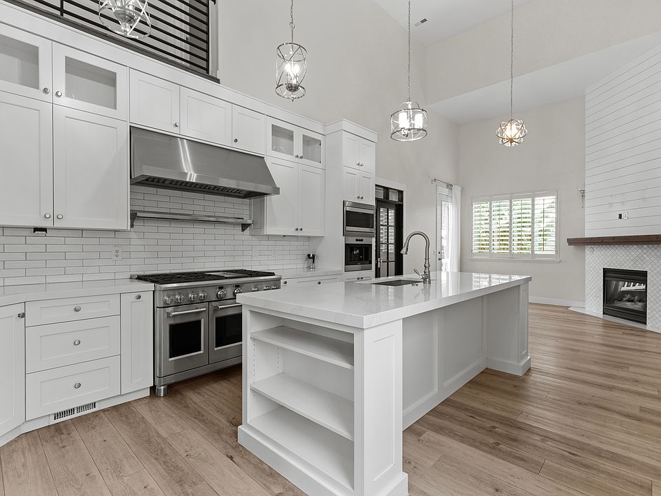 The heart of the home is a chef's dream kitchen with custom cabinetry, sleek quartz countertops, stainless-steel appliances, and designer lighting. Every space feels intentional, open, bright, and crafted for comfortable living and effortless entertaining.