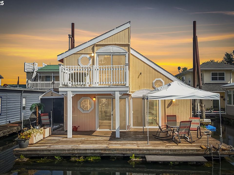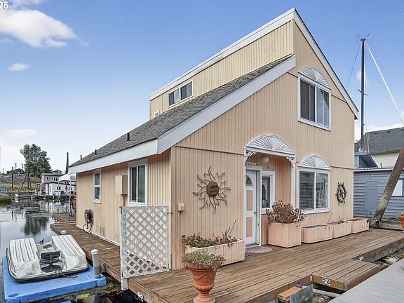 Opportunity awaits for you in an owned slip moorage to make this cute cottage your own! A location close to the ramp yet off the main access walk provides a level of privacy sans a long journey & Islands moorage has wide river spaces between the rows for easy navigation & lower density atmosphere. Capture sunset & Government Island views from the balcony & the main level deck has ample covered and uncovered spaces for year round access & river enjoyment. Built in 1979' the home features 1090sf of living space on 2 levels in a unique cottage contemporary design, indicative of the era built & mid-late 70's designs. The main level has a bedroom pier side with ample closet space & a full bathroom just inside the foyer. The staircase just inside rises within the vaulted space & the river side of the main level is akin to great room layouts found in newer homes with the kitchen, dining nook, & living room near open to each other. A stackable washer & dryer is nestled into a pantry / utility closet and the kitchen lives large with open space & smart layout given the homes' size. The cozy living room has big views via sliding glass door to the river & a gas fireplace will warm you in the cooler months. A mini split system provides efficient heat & AC, serviced recently. The upper level has a relaxed family room with slider to an upper balcony to take in sunsets to the west, & island views to the NW. A second bedroom on the upper level is spacious & has a good sized closet and additional unfinished attic storage. Ceiling fans through keep the air moving & temps as desired. Light remodeling, cosmetic updates, fixture and surface updates all await the next owner to make this comfortably sized contemporary cottage their own at an affordable price! Gated and secured with ample guest parking, low monthly dues, & a well maintained moorage will complete your river centric lifestyle! **Carpet on main replaced and interior painted following initial photo shoot; additional photos incl