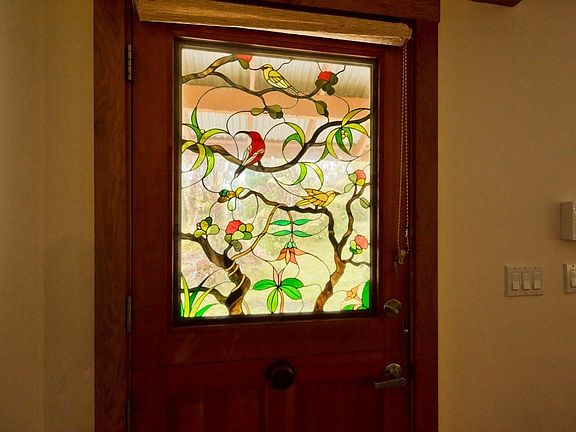 Some features of this house are high vaulted ceilings, ample storage space, built in shelving units and high vaulted ceilings. Did I mention the beautiful stained glass front door depicting the native forest birds of Volcano. During the cool volcano winter nights, enjoy the gas fireplace to keep warm.