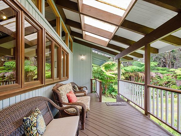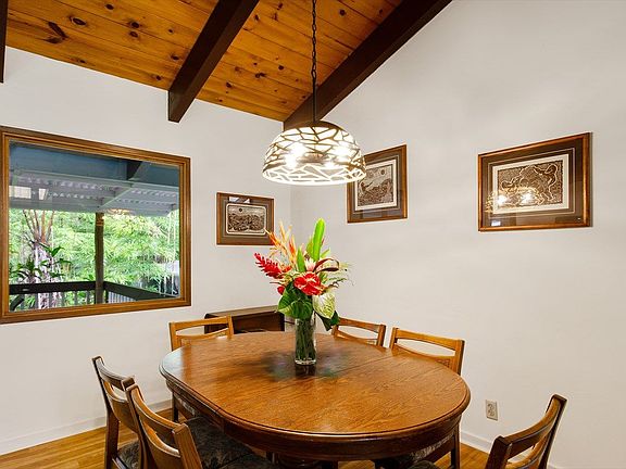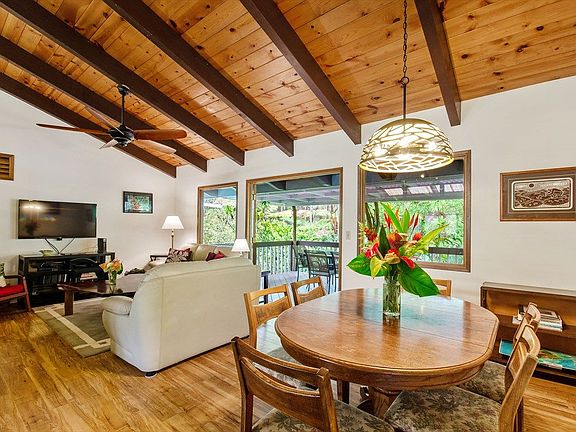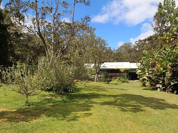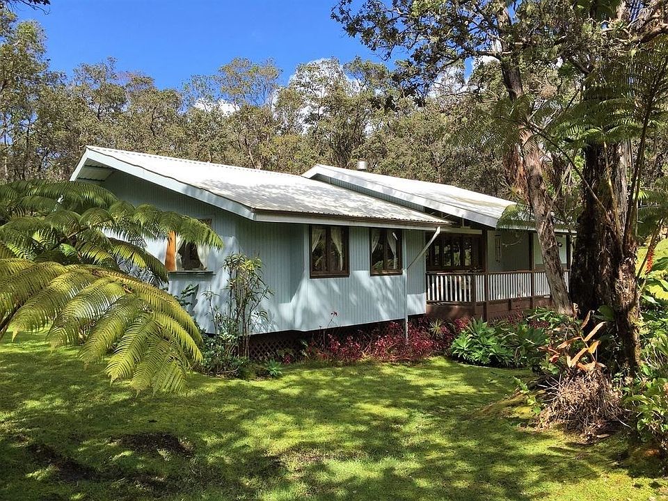 This quiet and private Volcano Gem is hidden away on over an acre of landscaped lawns and mature native forest. The home features covered decks at both the front and rear, a spacious great room with a wood burning fireplace, dining area and roomy kitchen with views of beautiful lawns and gardens. The custom designed home is simple, but has special touches like wood framed windows, French doors to the back decks, large windows, and a lovely stained glass accent at the front entrance into the open beam great room. Floors throughout the home are high end waterproof laminate.Volcano Village is an active community of both long term and short term residents with many artists, scientists, employees of the National Park as well as people who work in Hilo living in the area. All enjoy the elevation, cool climate and rain forest setting found here. Volcano Village is also sought out by people from other islands who are looking for a second home, a home for future retirement, or people just wanting to enjoy the peace and quiet that you find at the Volcano. If you are looking for more than just peace and quiet, you can also join in the fun and activities at the Cooper Center where they hold a Farmers Market on Sunday mornings, the Art Center where you can join in classes or just enjoy a bike ride or a hike through the gorgeous Volcano surroundings.