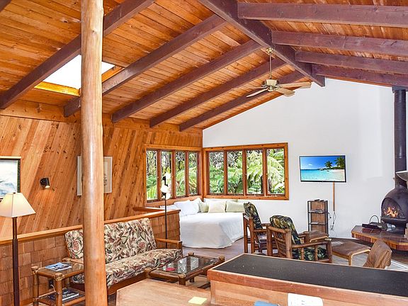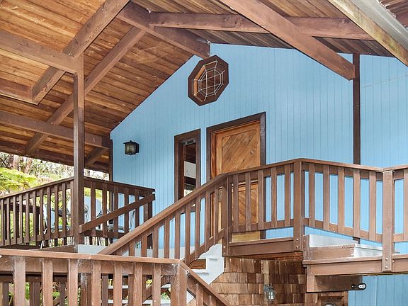 19-4075 Kalani Honua Lp. is a custom home conveniently located in the Village while still giving the feeling of being in your own private forest. You are welcomed by a grand covered staircase with lava rock accents that lead to the front entrance lanai. The warm colors of the natural wood are hard to miss giving you a homey cottage feel throughout. Open beam ceilings, a wood burning fireplace & a wet bar are just some of the highlights of the living room. The kitchen features a convenient pass-through option between the Koa cabinets to the dining table. Upstairs offers one bedroom with a full bath, Downstairs offers two bedrooms and the second bathroom. The downstairs bedroom can be used as a mother-in-law suite or a source of rent as it has a separate entrance. Walking distance to Volcano restaurants and shops, Farmer's market and the US Post office. Minutes away from Hawaii Volcanoes National Park, Volcano Country Club and Volcano Winery! Information herein deemed reliable but not guaranteed. Buyer and buyer's agent to do their own due diligence on all pertinent facts including but not limited to the bed, bath and square footage of the home.