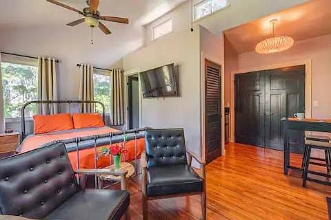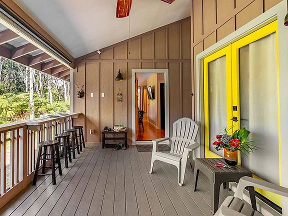 This custom-built Volcano Village home is like no other. Two separate spaces under one roof are connected with covered lanai where you can spend your mornings eating at the breakfast bar while listening to the birds. There is second primary suite with a kitchenette which can be used as an artist studio, in-law unit, or for rental income. Soaring ceilings, hardwood floors, custom tile, a Jotul gas stove, dishwasher, large screen tv’s, and a UV water filtration system are just a start of the features of the home. The orchard on the property has bananas, apples, peaches, plums, many other exotic hybrid stone fruit trees, and raised beds for gardening, or maybe you would just like to relax in the hot tub in the back of the fully fenced yard. A complete security system with remote locks guarantees your privacy. A listing like this won’t last long. Lucky we live Volcano.