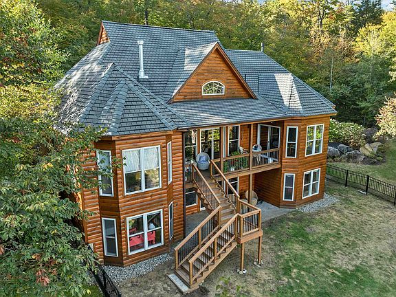 Welcome to Moose Manor. This exceptional view property is a secluded luxury log home tucked into the scenic foothills of the Ossipee Mountains on a private 4 acre lot in low-tax Moultonborough, NH. When you approach the property, you are immediately welcomed by a dramatic entry flanked by stone pillars and a rustic moose sculpture, leading to professionally designed landscaping and artful lighting that frame the home. The expanded ranch layout offers effortless, single-level living, featuring an open concept main living area that includes a chef’s kitchen with professional appliances, dining room and living room with field stone fireplace. The main floor also offers a cozy sun porch, spacious primary suite with walk in closets and a dedicated office (which is listed as the 4th bedroom). An open and inviting staircase brings you to the walkout lower level with a spacious family room and two ensuite bedrooms. Nearby, a matching log garage with two additional garage bays offers unfinished bonus space above. New HVAC system. The garage space is incredible. With four garage bays and just 20 minutes from Club Motorsports, this property is a dream for car enthusiasts. Two golf courses nearby - Birch Hill and Bald Peak, as well as extensive hiking trails. Lake Winnipesaukee is a short drive away where you can access the Lake as a Moultonborough resident. Schedule your private tour of this beautiful property today and experience the best of New Hampshire's Lakes Region.