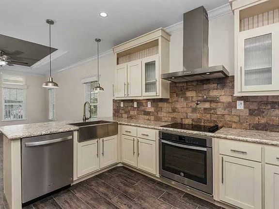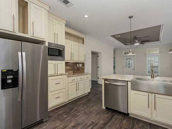 Full back porchFrench doorsBuilt-in microwaveHardi-board sidingFarm sinkCorner lotWood plank laminate flooring