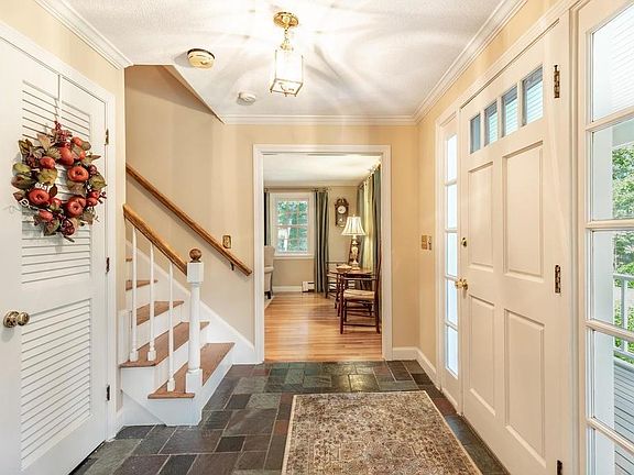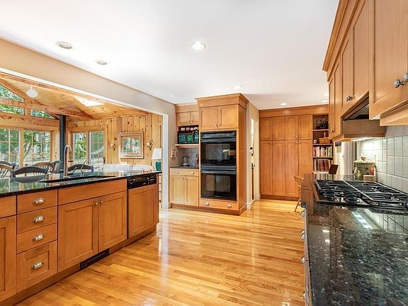 Set high from the road on a private lot this 4 bedroom colonial is the perfect retreat. While the days on a comfortable chair on the expansive farmers porch overlooking the wooded yard. Front to back living room with hardwood & wood burning fireplace. Formal dining room. Chef's kitchen is open to "lake house" addition that serves as a bright and sunny informal dining and sitting area with access to the deck and rear yard. Large family room with built ins and additional fireplace. Living space continues over garage with office and bonus room! Four bedrooms on 2nd floor including nicely sized master with ensuite bath and large closets. Great storage in lower level. Gazebo once hosted a wedding! New roof and windows 2011!