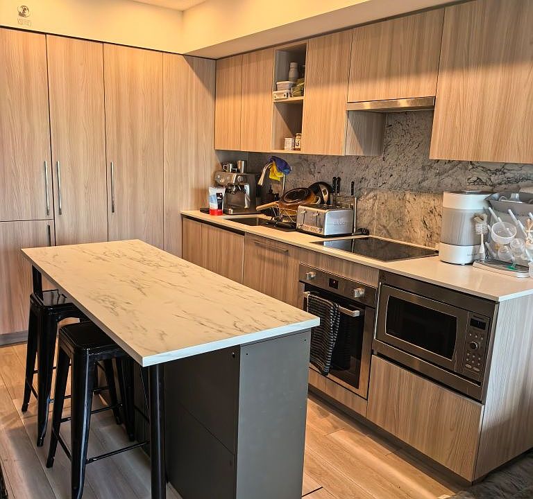 Near Lake front, TTC, restaurants and entertainment. East comfortable view, open concept floor plan, very bright and quiet unit, Kitchen counter, Nice Den, good size bedroom with walkin closet. Loblaws, Shoppers Drug Mart, LCBO are just downstairs of the building. Very clean unit, visitor parking, very clean unit.