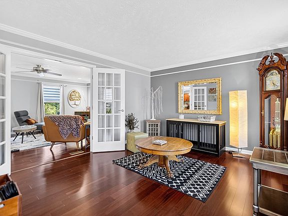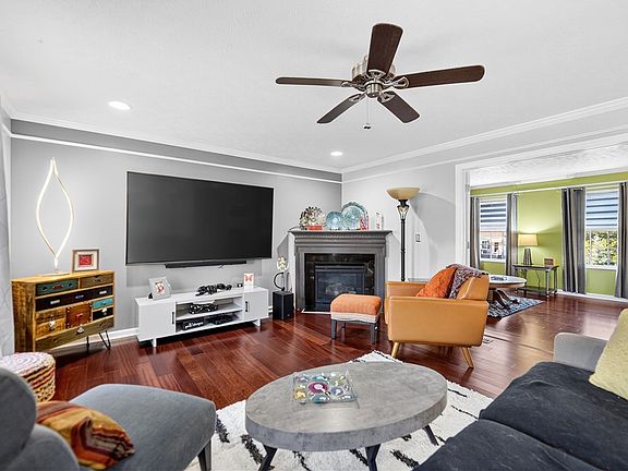 Large LivRm w/ a Gas Fireplc, Recessed Lighting, Ceiling Fan, Beautiful Flooring, Custom Blinds (throughout home) & Double Glass French Drs leading into 1st Flr FamRm. Beautiful Brazilian Hardwd Flrs in Formal Din Rm w/ Detailed Crown Molding accented w/ Trim work plus Chair Rail Trim & Baseboard, Archway to front entry and Gorgeous Candle-style Chandelier! Awesome Gamerm w/ Kitnette & Powder Rm to Cov'd Patio. Vaulted Ceiling w/ Display Ledge Primary Bedrm Suite.