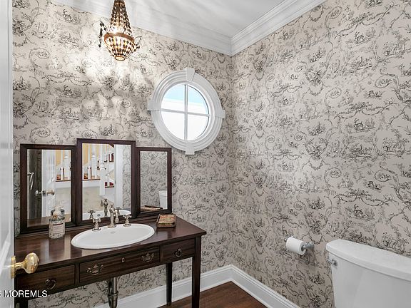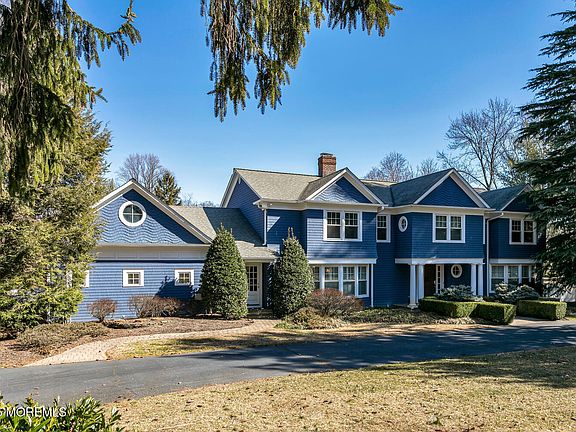 Situated in the prestigious estate section of Rumson, this exquisite residence is a private sanctuary of elegance and charm. Enveloped by lush specimen trees, the beautifully landscaped grounds feature a serene pool, expansive patio, and seamless indoor-outdoor living. A grand foyer with a sweeping staircase and intricate millwork sets the tone for timeless sophistication. The stately dining room, complete with a bay window, fireplace, and built-ins, flows effortlessly into the butler's pantry and chef's kitchen. A private first-floor ensuite bedroom offers versatility, while the luxurious primary suite boasts a sitting room, balcony, two walk-in closets, and a spa-like bath. The finished lower level features a full kitchen and bar, wine cellar & French doors to poolside retreat. bar, wine cellar, and French doors opening to the poolside retreat. Minutes from the NYC ferry and top-rated schools, this exceptional home offers the perfect blend of grandeur and modern convenience.